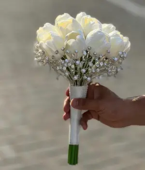 دسته گل عروس رز سفید یکی از کلاسیکترین و رمانتیکترین انتخابها برای مراسم عروسی است. این مدل دسته گل معمولاً به صورت ساده و شیک طراحی میشود و میتواند تنها از رزهای سفید تشکیل شده باشد یا همراه با برگهای سبز، گلهای کوچک تزئینی مانند ژیپسوفیلا یا حتی مرواریدها و روبانهای ظریف باشد.